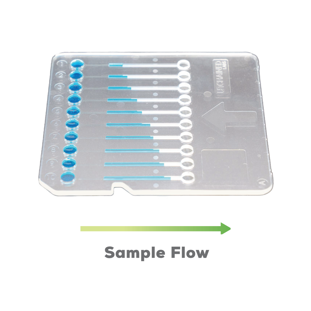Bun 耗材內建 10 條微流道,樣品從左側加載孔流經通道進行黏度測量