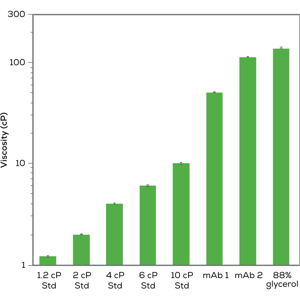 下圖展示不同黏度標準品與單株抗體樣品的測量結果,Honeybun 能夠精準區分 1.2 cP 至 88% 甘油 (約 100+ cP) 的廣泛黏度範圍,準確度與精密度皆 <3%。