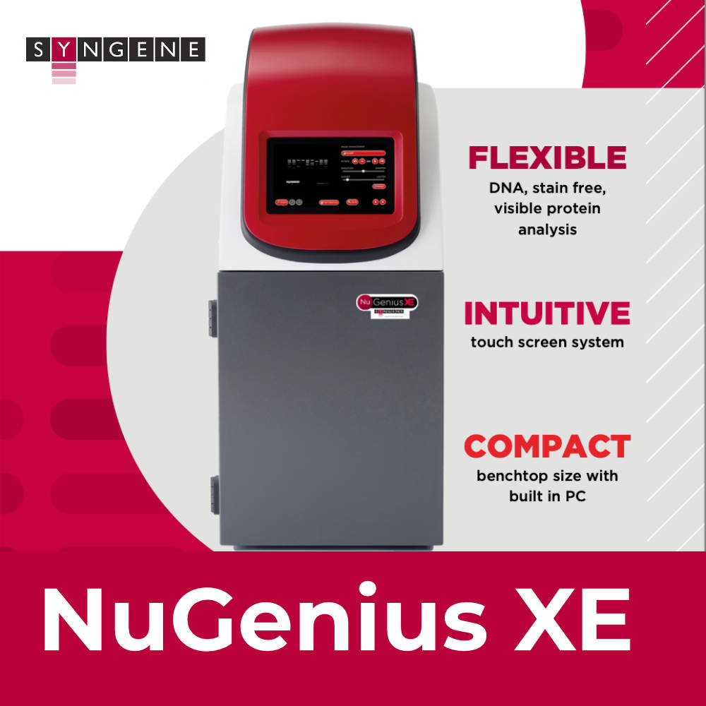 The NuGenius XE represents a breakthrough in standalone gel documentation with its integrated Windows 10 Enterprise PC and 7-inch touchscreen interface. This compact benchtop system features a groundbreaking 5MP camera with exceptional sensitivity and an F/1.2 motor-driven zoom lens capable of imaging samples up to 20 x 24 cm - remarkably large for such a compact unit. The built-in PC upgrade from Raspberry Pi provides superior connectivity, with 80GB internal memory for local image storage and support for USB and network transfer. The intuitive touchscreen interface running GeneSys software guides users through simple touch-based workflows, with automatic selection of optimal lighting and filters based on gel type and dye selection. A key differentiator is standard Stain-Free imaging capability, enabling label-free total protein detection on gels without chemical staining, saving time and preserving sample integrity for downstream applications. The camera is optimized for extended exposures required for Stain-Free imaging. An optional safety shield allows safe DNA band excision under UV illumination with the darkroom door open. Network connectivity enables remote support from Syngene technical specialists and allows IT teams to apply security settings remotely. The system comes with unlimited GeneTools licenses and supports direct USB printer connection for immediate hardcopy output.