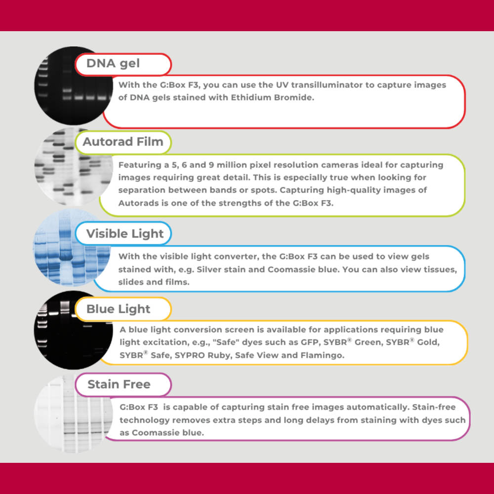 適用於螢光和可見光應用,包括 DNA/RNA 電泳、蛋白質凝膠、PCR 檢測、質體驗證、Blot 檢測。搭配 GeneTools 提供條帶定量、分子量估算功能。