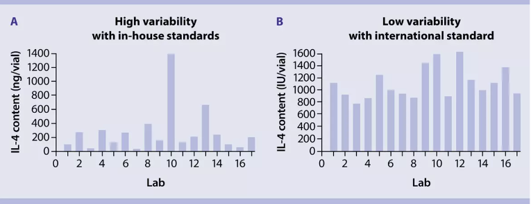 為了使不同供應商和實驗室之間的細胞因子活性數據具有可比較性,生物活性檢測法必須使用由 世界衛生組織(WHO) 定義的國際認可標準品進行校準。此類標準品涵蓋大量細胞因子,由英國國家生物製劑和控制研究所(NIBSC)負責分配。