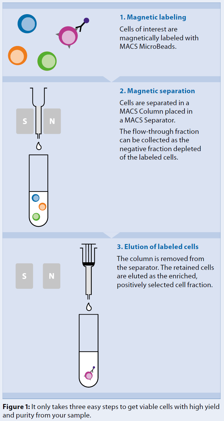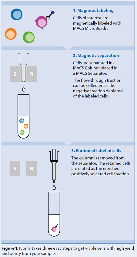 MACS® 磁珠技術的長期成功歸因於將納米級超顺磁性微珠與 MACS column中強磁場的巧妙結合,僅有這項技術能確保對目標細胞最低程度的標記,並保持細胞特性,不會活化細胞。使用 MACS 微珠進行細胞分選只需三個簡單步驟:磁性標記、磁性分選和最後elution標記的細胞(圖1)。