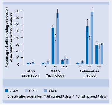 (使用 MACS CD19 MicroBeads或另一製造商column-free正向篩選方法富集人類 B 細胞。隨後,在有或無 B 細胞刺激試劑 CD40-Ligand/Anti-His antibody 和 IL-4 情況下培養細胞 7 天。利用流式細胞儀直接測量細胞分離後及培養有無刺激試劑情況下的激活標記物(CD69、CD80 和 CD86)。MACS 磁珠未改變目標細胞狀態,而column-free方法在缺乏刺激試劑時活化了 B 細胞。, 圖4對於特定標記的目標細胞進行Straightforward positive selection)