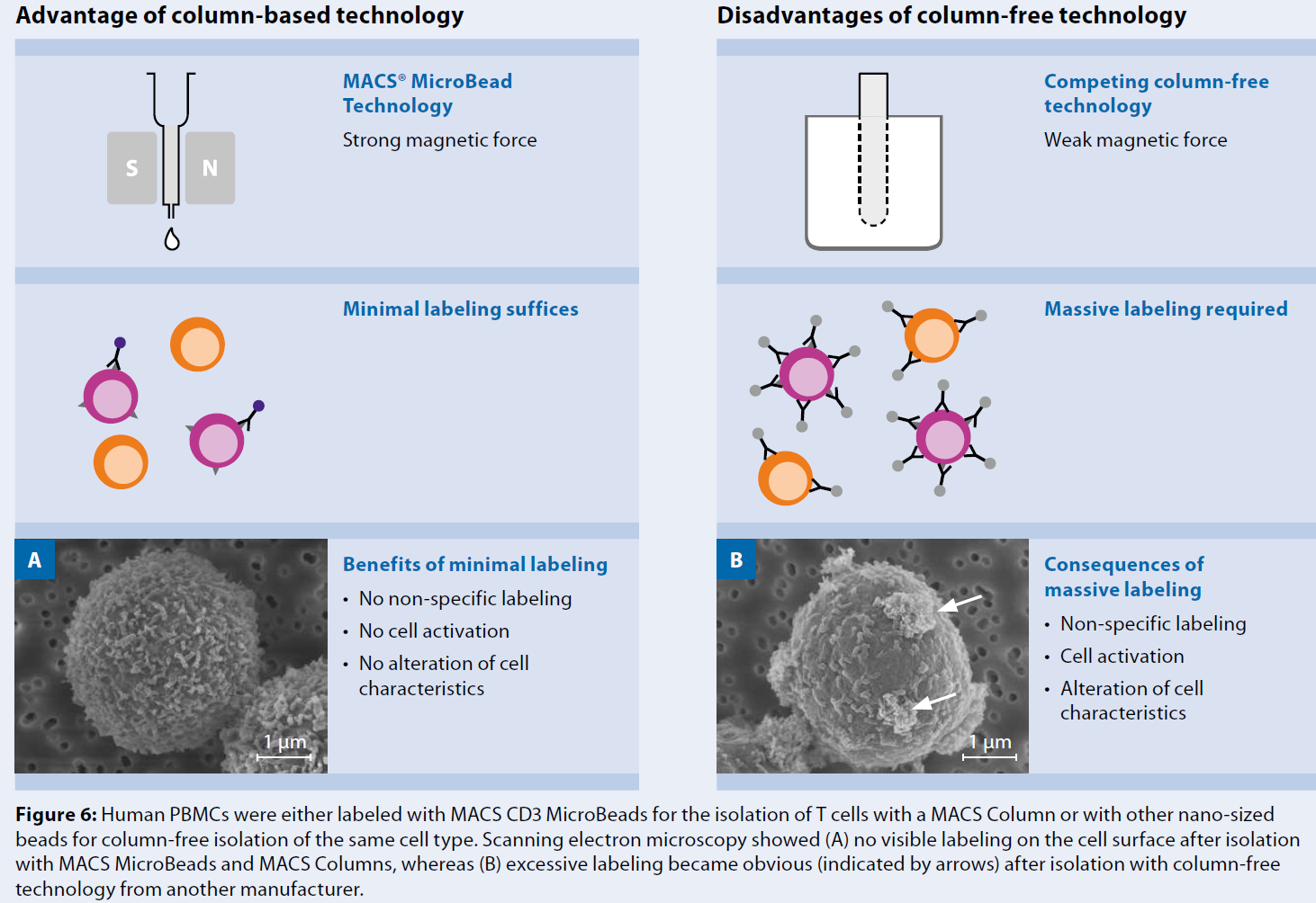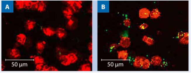 (利用 (A) MACS Monocyte Isolation Kit II, human 或 (B) 另一製造商提供的column-free人類單核細胞分離套件,通過消除不需要的細胞來豐富單核細胞。分離後對單核細胞(紅色)和納米級磁珠(綠色)進行染色顯示,使用column-free Kit時,目標細胞呈現非特異性標記,而MACS技術提供了真正未受影響的細胞。, 圖 6 MACS 技術達到真正的label-free)