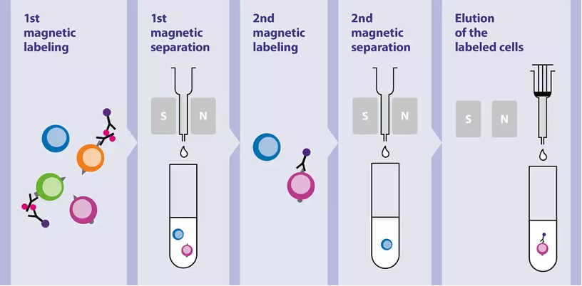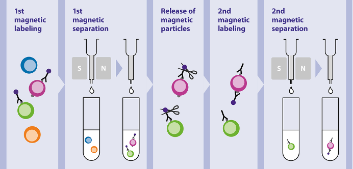 MACS MultiSort 磁珠兩次連續的正向篩選步驟,進行兩個不同的標記,來分離細胞亞群。首先使用針對第一個標記的 MACS MultiSort 磁珠進行第一次正向篩選。在分離後,細胞與 MultiSort Release Reagent 反應,則該試劑可以將 MultiSort 磁珠從細胞上去除。接著對目標細胞進行第二次磁性標記,使用針對第二個標記的 MACS 磁珠,再進行正向篩選。