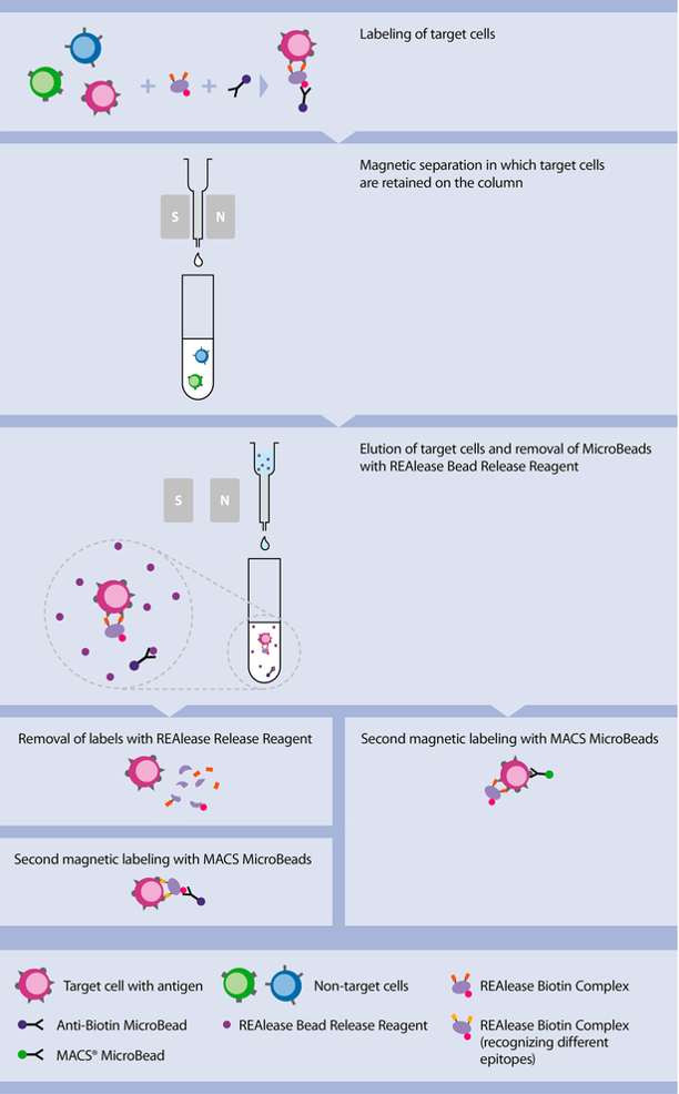 該技術依賴於重組工程的抗體片段,而不是抗體來標記特定的細胞表面標記物。這些抗體片段對細胞表位具有較低的親和力。但是,當這些片段被聚合形成複合物時,它們與目標細胞上的表位以高親和力結合,從而實現有效的磁性細胞分離。REAlease™ 技術可以控制片段的單一或聚合物狀態,從而在分離後觸發細胞表面釋放單體化的抗體片段。最終,經過正向篩選分離的目標細胞不含抗體片段和磁性標記,因此可用於進一步的分離步驟。當然,此分離步驟中的未標記的細胞亦可用於後續的正向篩選分離。