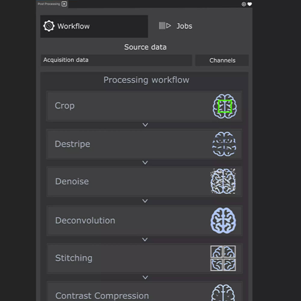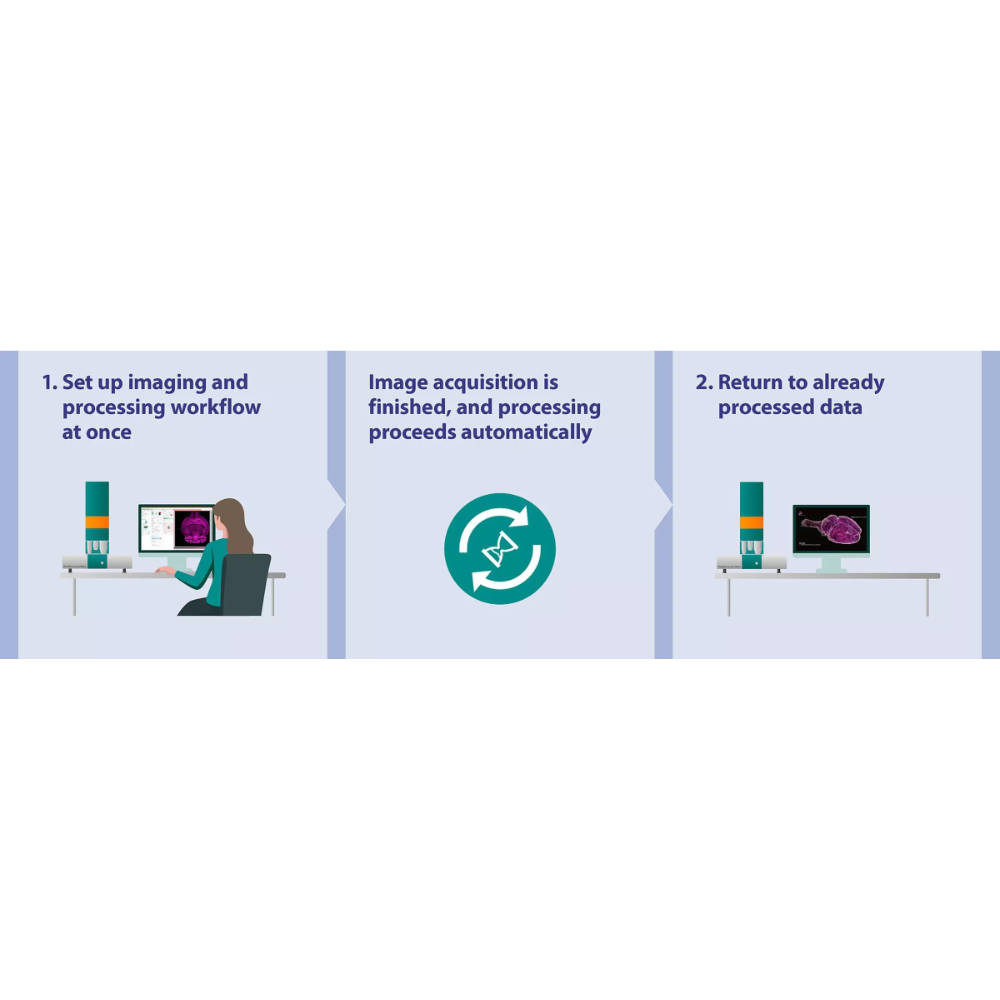 一旦影像採集完成,處理程序將自動啟動,無需手動開始處理。這種自動化機制不僅節省時間,更讓層光 3D 影像處理變得輕鬆簡單。搭配批次處理功能,使用者可以對多個資料集進行佇列處理並啟動各種工作流程,特別適合處理大量資料集和使用 UltraMicroscope Blaze 或 Choros 進行多樣本影像處理。
