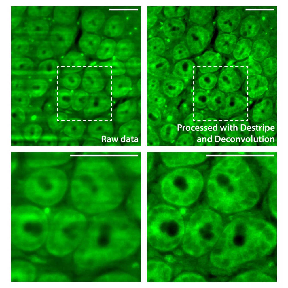 層光顯微鏡的挑戰之一是沿照明路徑的小結構(如灰塵顆粒、氣泡或色素病灶等雜質)造成光散射或吸收而產生的條紋偽影。我們開發的去條紋功能能有效消除這些偽影,同時保留真實的樣本特徵。