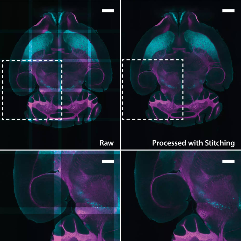 UltraMicroscope 平台允許使用者捕捉大型且複雜的透明生物樣本,如整個器官或完整小鼠,這些樣本通常超出物鏡的視野範圍。拼接功能將這些可能高達數 TB 的 3D 瓦片組合成單一、無縫且高解析度的 3D 堆疊。只需在軟體中點擊一個按鈕,3D 馬賽克堆疊即可無縫拼接,無需任何手動干預。