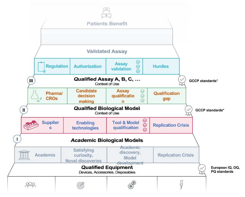 Organoid 與 in vitro 模型從實驗室走向商品化,必須建立在穩健的品質管理系統之上。依應用目的不同,開發成熟度可區分為三個層級: