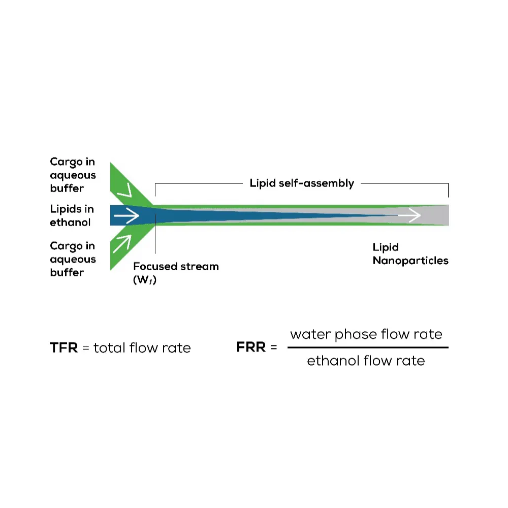 Sunny 採用「Hydrodynamic Flow Focusing」技術,利用兩側的流體壓縮中央流體,縮短擴散所需的距離,加速混合過程。由於層流的特性,此方法具有低壓力、高可控性的優點,能精確調控粒子性質並獲得優異的 PDI 值。