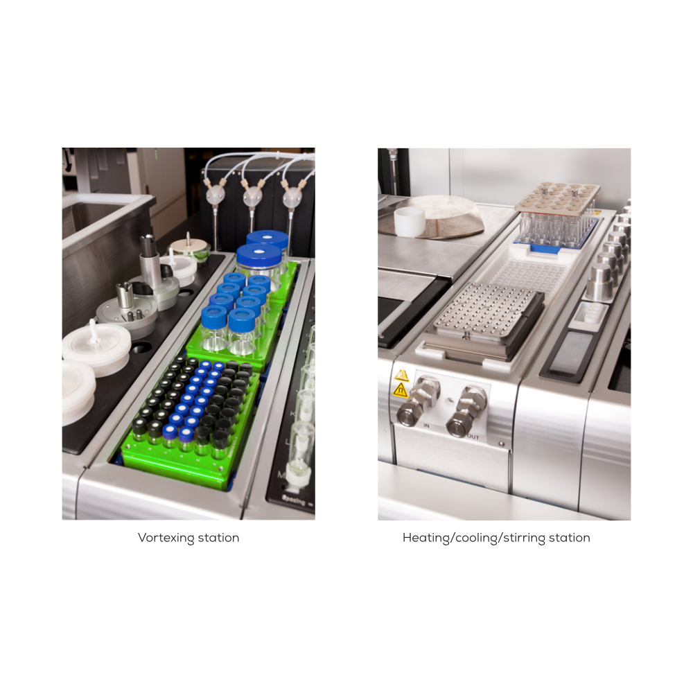 Vortexing station 可執行軌道式震盪 (60-3570 rpm),模擬運輸或製造過程的機械應力。Heating/cooling/stirring station 提供 -20 至 180°C 的溫度範圍,搭配磁力攪拌功能,可進行加速穩定性研究。透過排程器整合培養箱與 freeze/thaw 模組,可實現自動化的長期穩定性研究。