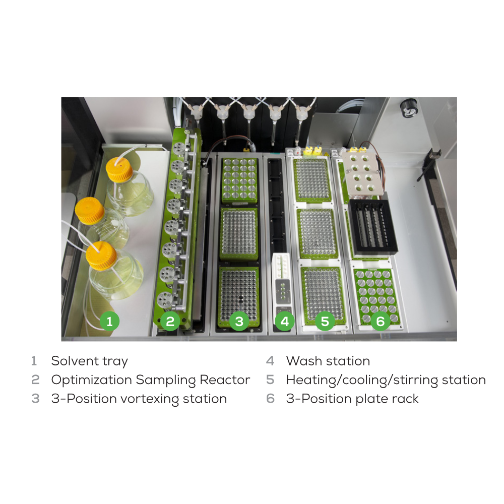 精巧高效的桌上型機種,保留核心自動化功能並優化佔地空間。同樣支援 OSR 即時取樣與多變數篩選,每週可處理數百種反應條件組合。適合空間有限但仍需高通量篩選能力的實驗室環境。