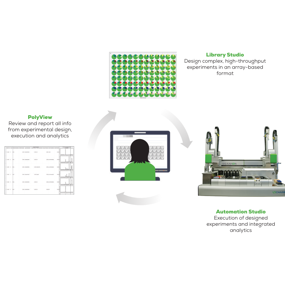 Library Studio 設計高通量陣列式實驗,Automation Studio 執行自動化流程並整合分析儀器,PolyView 彙整所有實驗設計、執行數據與分析結果,確保數據完整性與可追溯性。