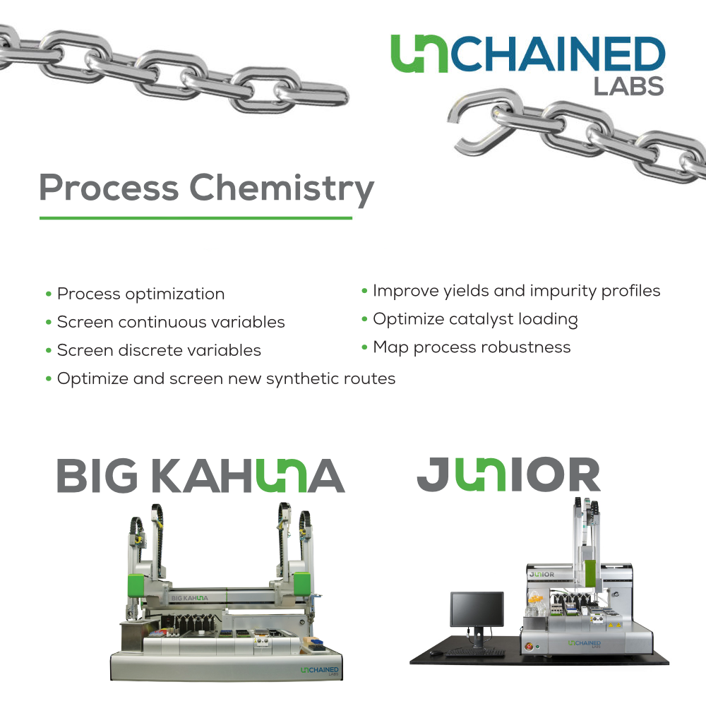 Unchained Labs Big Kahuna and Junior represent the next generation of laboratory automation platforms specifically designed for process chemistry applications. Built upon the extensive expertise acquired through the strategic acquisition of Freeslate in 2016, these systems combine over two decades of high-throughput experimentation know-how with cutting-edge automation technology to accelerate API development and manufacturing process optimization.