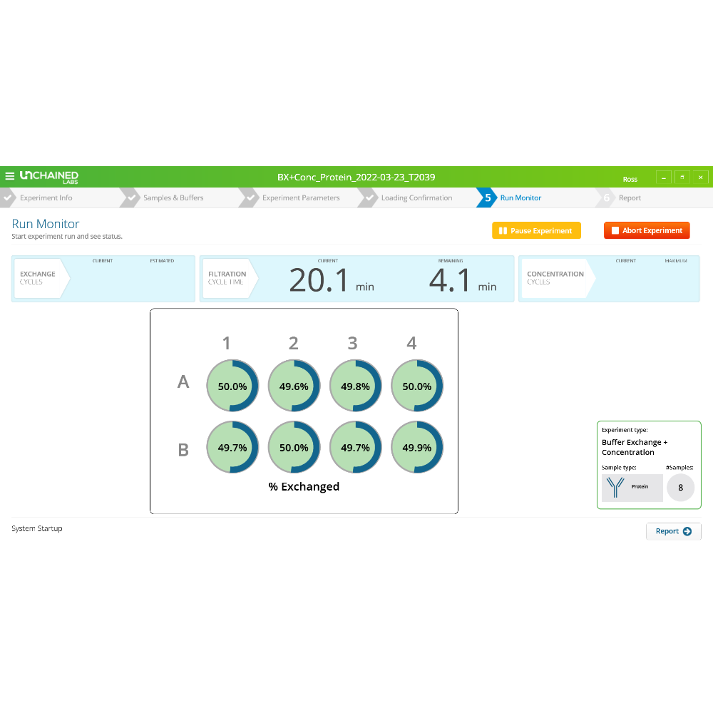 按下啟動鍵後讓 Unagi 開始工作。此時您可以離開去處理其他事務,但也歡迎隨時回來查看。系統會追蹤已完成的交換循環次數、提供當前過濾循環資訊,並顯示每個樣品的交換百分比。如果趕時間,您可以暫停實驗取出已完成的樣品,或讓其繼續運行。無論如何,Unagi 都會在完成時通知您。