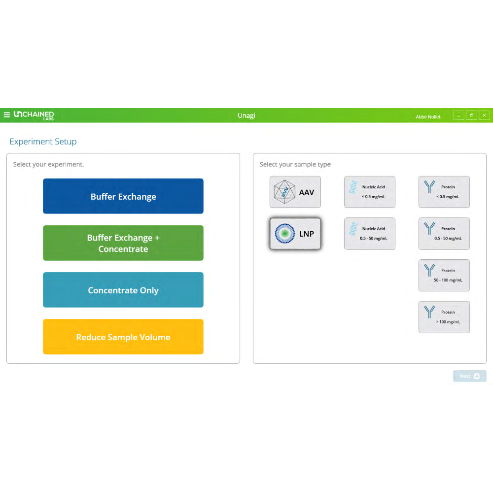 Unagi 操作極為簡單,任何人都能輕鬆上手。首先選擇您要執行的實驗類型,接著輸入要交換的分子種類、樣品量以及目標緩衝液。最後輸入交換百分比與最終體積(如需濃縮樣品)。